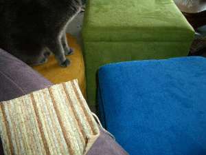| March 11 | Sheri and I met to make lots of decisions! We picked fabric for the sofa and fabric for the chaise and we nixed the chair we were thinking about. We picked the surfaces for the desk and the office stuff and the media center and the hall shelves and the kitchen mug shelves! It's yummy. We picked reed shades for the living room (and, I think, for the terrace, too, but I forgot to ask - maybe she's doing something else for the terrace - basically there the chore is to hide the storage stuff on either end). She showed me how I could have french doors for the closets in the bedroom!! I had a condo once years ago that had french doors for the bedroom closets and I loved it. It makes the room look huge and the closets feel glamorous. There are two closets in the bedroom and we figured out what goes where. We picked a dresser and two nightstands to go with the bed in the bedroom - and the finishings on all of that. And she's hot on the trail of a very cool option for displaying all my postcards... Oh and we got the front room nailed, too - storage, an armoire and the kitty litter (this is my project). Progress!!!!! We are so making progress. Plus: The kitty litter. If you treat Google right, you will see that the world of litter box fine furnishings is huge and varied. There are faux potted plants with litter boxes hidden in them and all kinds of cupboards. But, what I ended up going with is a bench/chest.