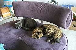 I am going to add another shelf on either side but for now, it is heaven to have stuff out of boxes and off of the floor! The next step is carpet. Wednesday, May 4th. I hope, I hope. I have learned not to count on anything until I actually see it. But, we have promises for carpet installation on Wednesday. In preparation for that, my bed is gone - new one arrives next Saturday. My mattress is on the floor for now. But, I think I made a major misstep. Also gone as of today, the old couch. The love seat is in it's place for now. And while it's lovely to look at and fine for sitting, it's just not going to cut it for lounging and watching TV. The chaise lounge will be for that BUT it is still 2 months away from delivery. The smart money would have been to hold onto a chair I had that I tossed out in one of the first purges. I should have kept it until the chaise comes. Oh well. Too late now! And... at least the cats are happy.