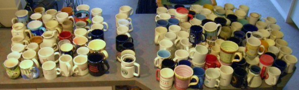 The Mug Project. I gathered all the coffee mugs. Well, all of them except the one currently holding my coffee. The ones on the left are the keepers. The 8 in the middle are maybes and the batch on the right are the ones that are going away. Of course, depending on what we finally come up with the batch on the left may be culled again.