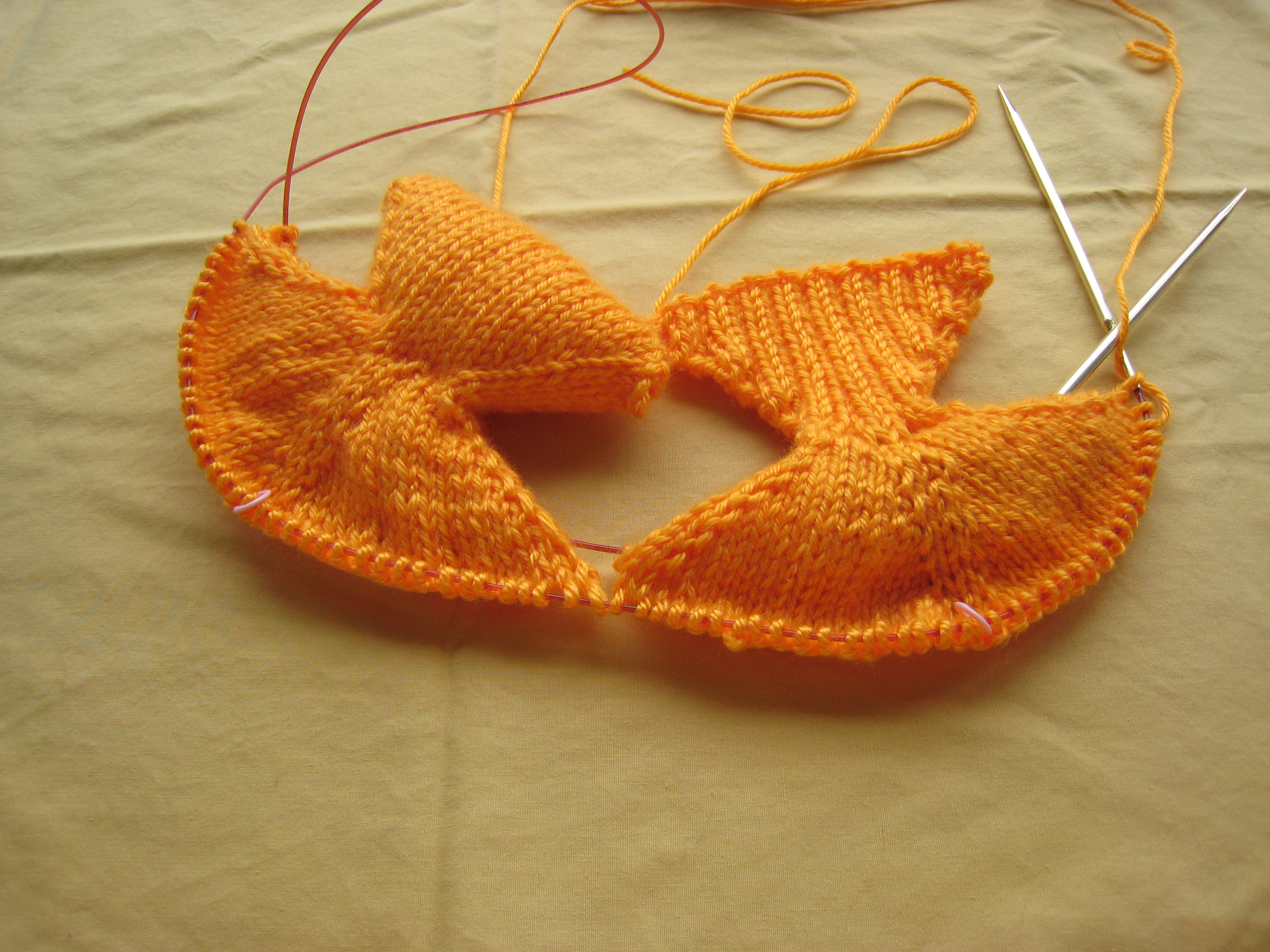 The fish are made starting from the bottom of the back fin and knit, in one piece to their their little puckered fishlips. The top and side fins are knitted in after the body is stuffed and finished. There are two versions. One has a stuffed tail fin which balances it better. The other has a ribbed tail fin which looks better. They start off differently but end up the same. Here's what I used to make the fish in the pictures: