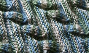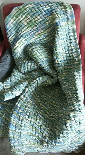 Waffle Afghan Pattern: Warm Thoughts from Patons Decorator Throws Stitches: 286 Needles: #6 Yarn: TLC Essentials - color 292-Oasis - 13 skeins each 4.5 oz Dimensions: 51" wide x 63" long Finished on: 9/11/04 Notes: I added a bigger side border and probably should