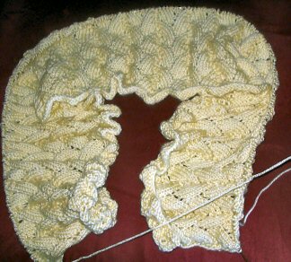| October 4, 2003 I'd forgotten what fun this pattern is to do. And it's moving along pretty quickly. I'm right at 29" and 7 skeins. |