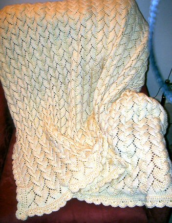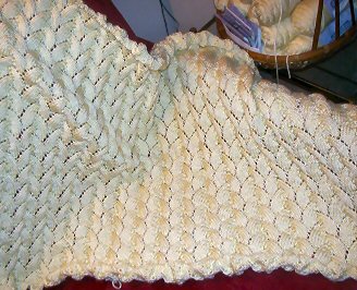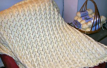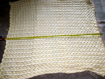 | September 29, 2003 This is 52" wide and, as you can see, 13.5" long so far. One thing about this pattern is that it does require a border all the way around it to finish it off. I'm not wild about doing borders but it's a nice look so I will. The border will fix that curl that you can see on the edge. So far I've used 4 skeins. So it's looking like the afghan itself will take about 16-17 skeins and the border will use another couple.