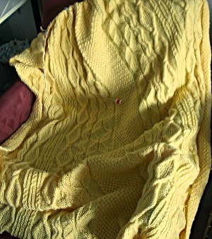March 7, 2004 This is turning out to be another fun one to do and I think it's going to be a fine finished project. There are a ton of errors in it. The first third is full of them. The last third will be better. But, I just figure that mistakes are what guarantees that it will always be recognized as 'made by hand'! So far this is 36" long. It's about 52" wide so I'll probably shoot for 60" long. I have enough yarn on hand.