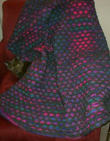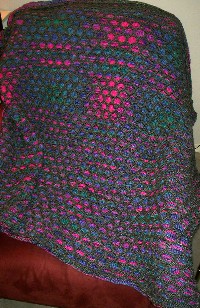 December 14, 2003 This is not my all time favorite afghan and, wouldn't you know it, it's the one I finally got big enough. I'll be working on it for a while - at least until the yarn runs out. The good news is that it is heavy and since it's pretty chilly out, the heavy feels nice on my lap. |